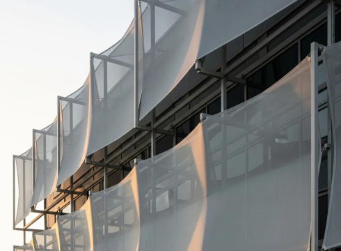 Tensile mesh facades are an innovative, durable, and cost-effective alternative to traditional metal mesh or perforated metal façade screens—often costing nearly 50% less than metal options. These fabric-based facades offer both functional and aesthetic benefits, making them an ideal choice for modern architecture.